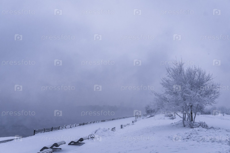 Раннее зимнее морозное утро над Енисеем в центре Красноярска