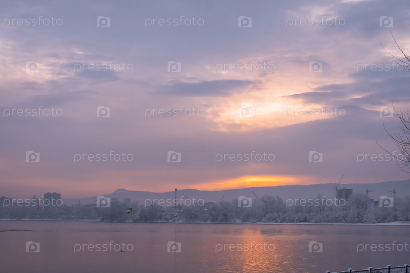 Раннее зимнее морозное утро над Енисеем в центре Красноярска