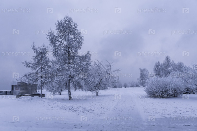 Раннее зимнее морозное утро над Енисеем в центре Красноярска