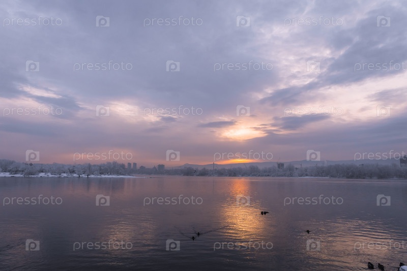 Раннее зимнее морозное утро над Енисеем в центре Красноярска