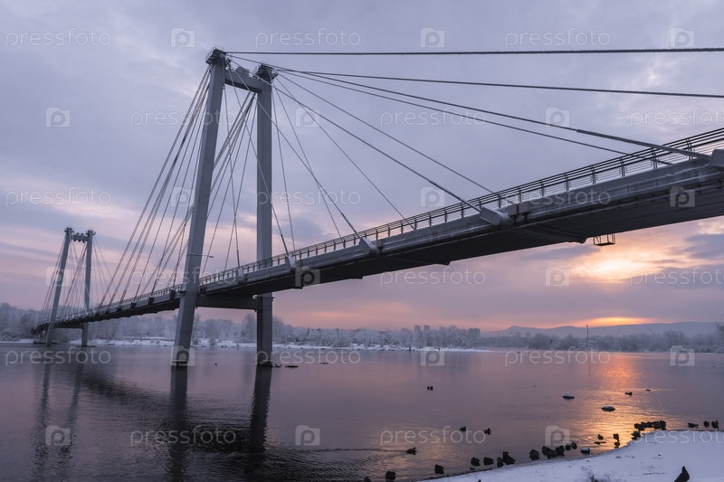 Раннее зимнее морозное утро над Енисеем в центре Красноярска