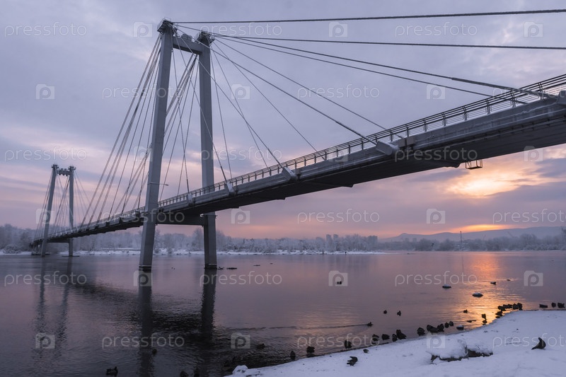 Раннее зимнее морозное утро над Енисеем в центре Красноярска