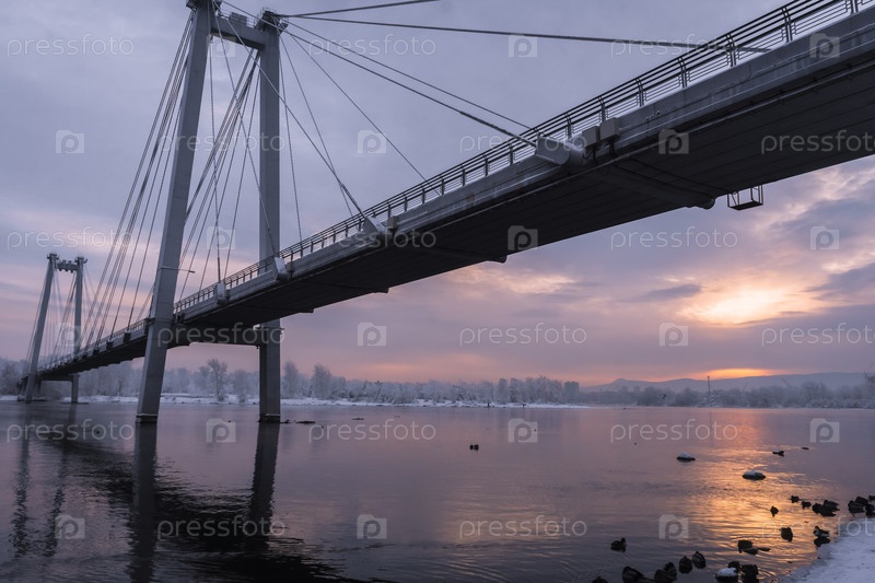 Раннее зимнее морозное утро над Енисеем в центре Красноярска