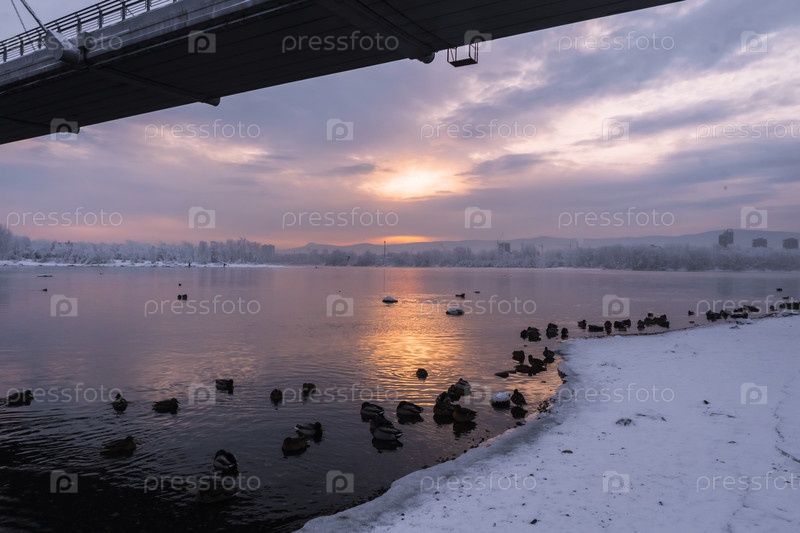 Раннее зимнее морозное утро над Енисеем в центре Красноярска