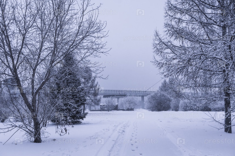 Раннее зимнее морозное утро над Енисеем в центре Красноярска