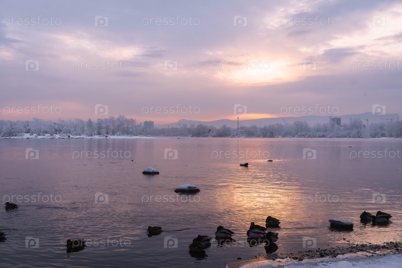 Раннее зимнее морозное утро над Енисеем в центре Красноярска
