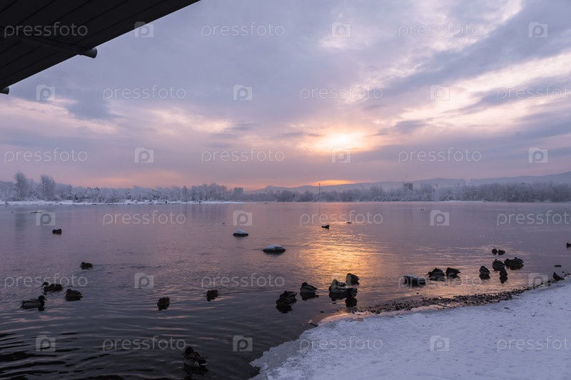 Раннее зимнее морозное утро над Енисеем в центре Красноярска
