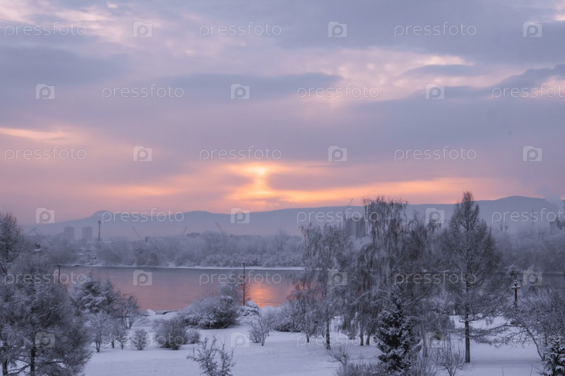 Раннее зимнее морозное утро над Енисеем в центре Красноярска