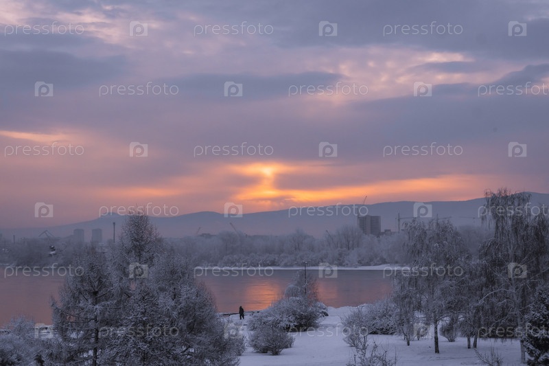 Раннее зимнее морозное утро над Енисеем в центре Красноярска