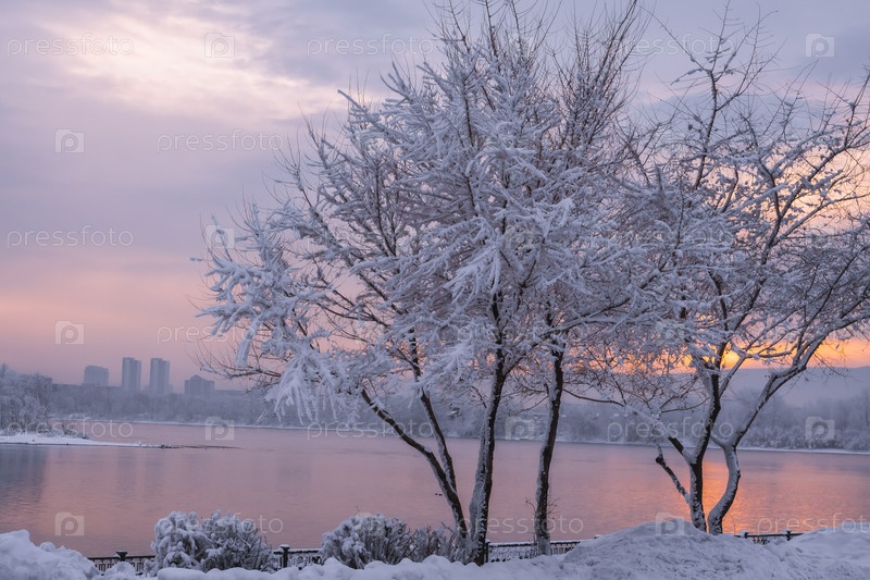 Раннее зимнее морозное утро над Енисеем в центре Красноярска