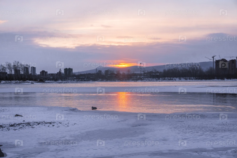 Раннее зимнее морозное утро над Енисеем в центре Красноярска