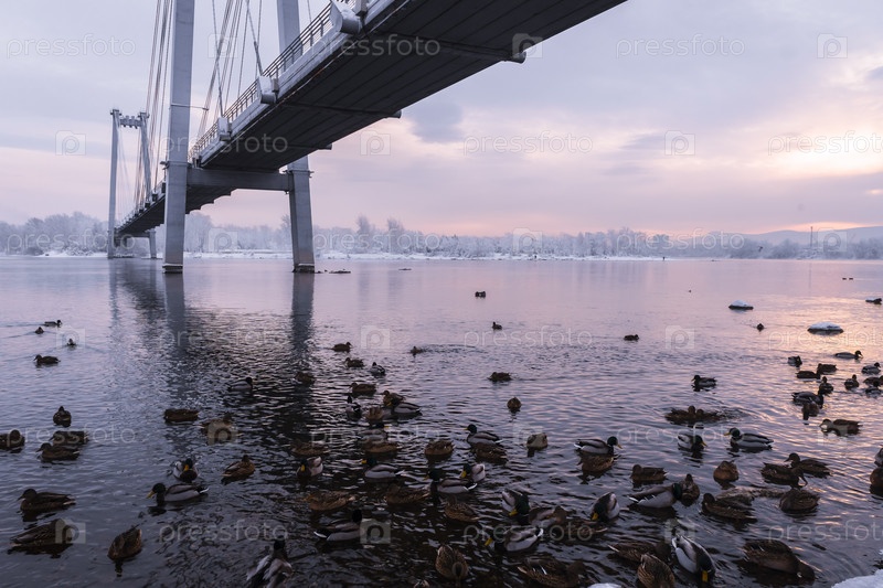 Раннее зимнее морозное утро над Енисеем в центре Красноярска