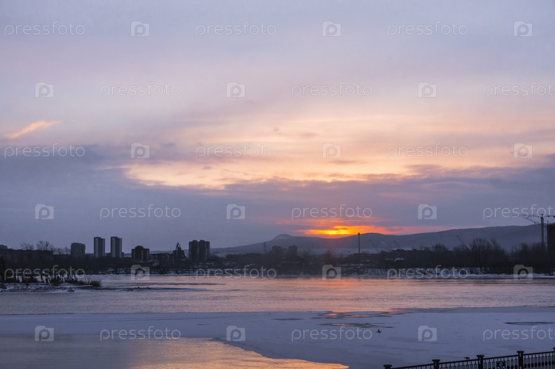 Раннее зимнее морозное утро над Енисеем в центре Красноярска