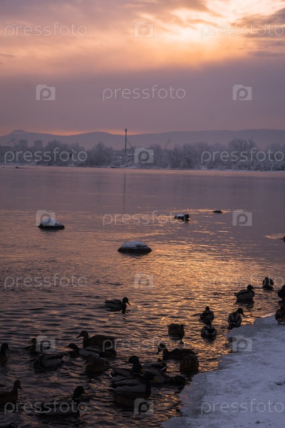 Раннее зимнее морозное утро над Енисеем в центре Красноярска