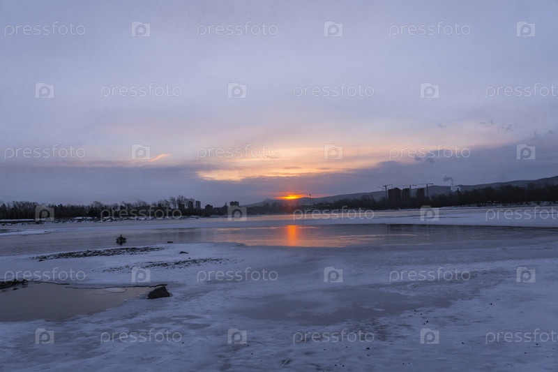 Раннее зимнее морозное утро над Енисеем в центре Красноярска