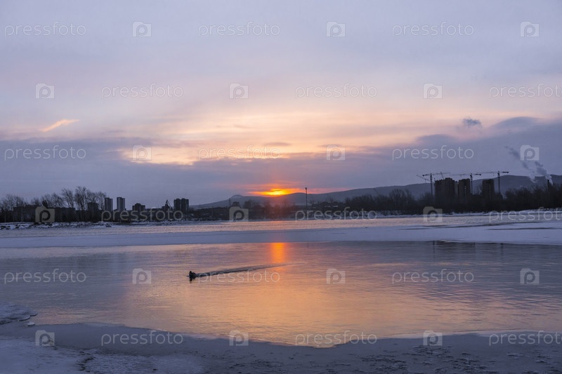 Раннее зимнее морозное утро над Енисеем в центре Красноярска