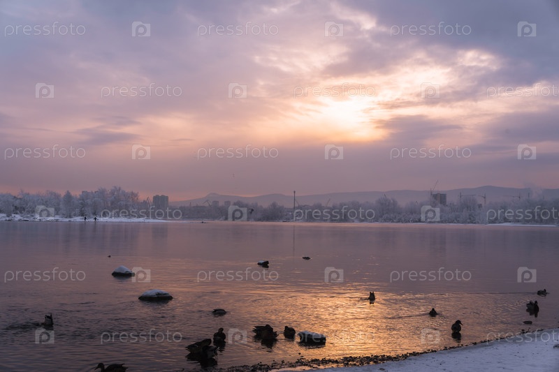 Раннее зимнее морозное утро над Енисеем в центре Красноярска