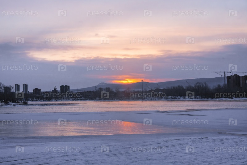 Раннее зимнее морозное утро над Енисеем в центре Красноярска