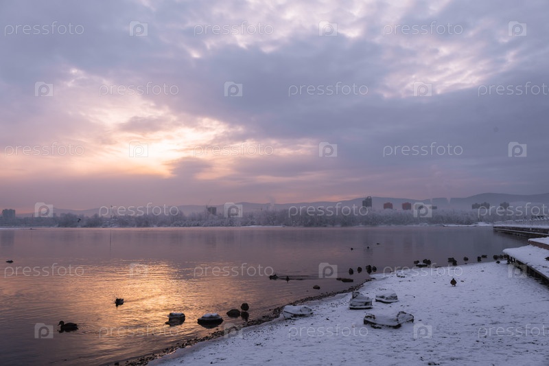 Раннее зимнее морозное утро над Енисеем в центре Красноярска