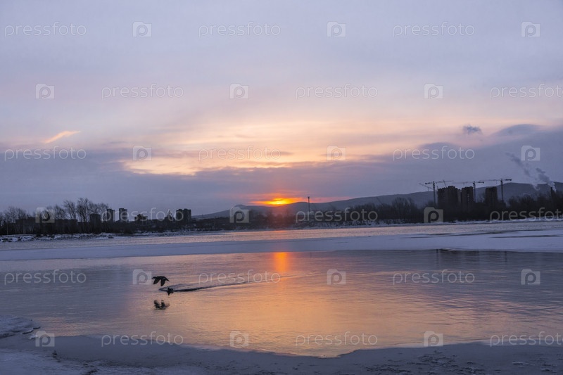 Раннее зимнее морозное утро над Енисеем в центре Красноярска