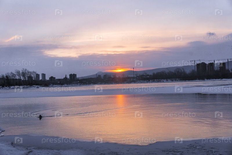 Раннее зимнее морозное утро над Енисеем в центре Красноярска