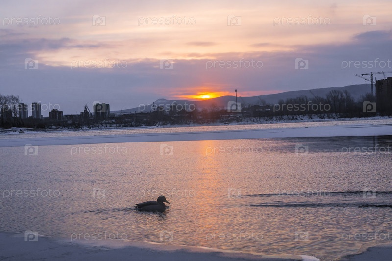 Раннее зимнее морозное утро над Енисеем в центре Красноярска