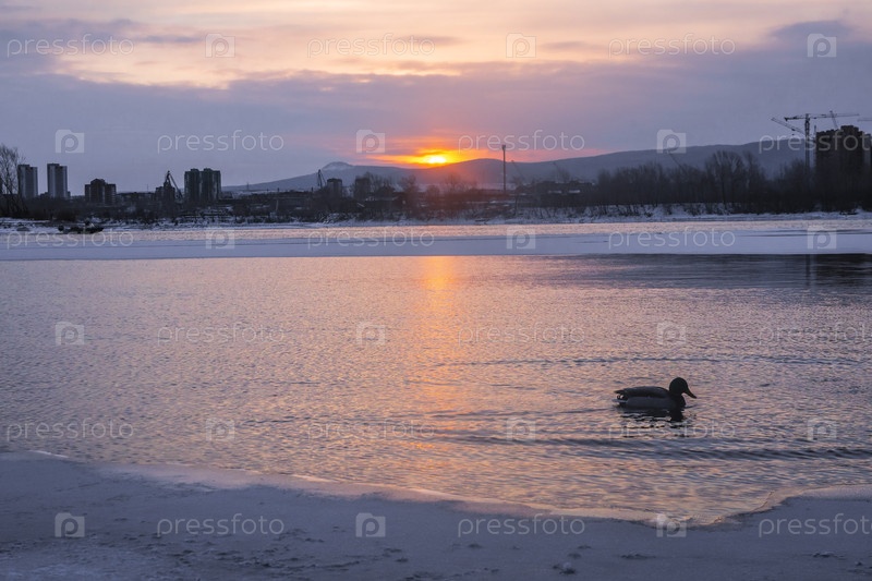 Раннее зимнее морозное утро над Енисеем в центре Красноярска