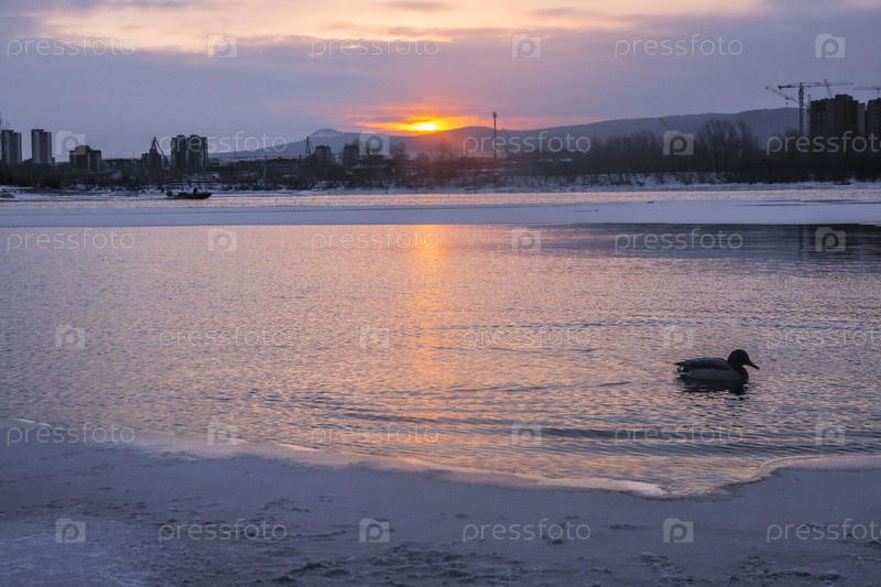 Раннее зимнее морозное утро над Енисеем в центре Красноярска
