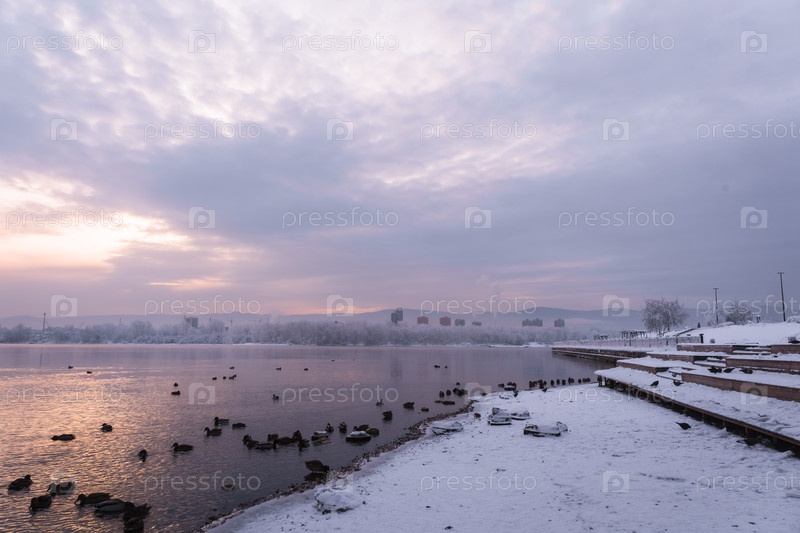 Раннее зимнее морозное утро над Енисеем в центре Красноярска