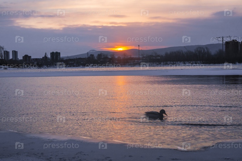 Раннее зимнее морозное утро над Енисеем в центре Красноярска