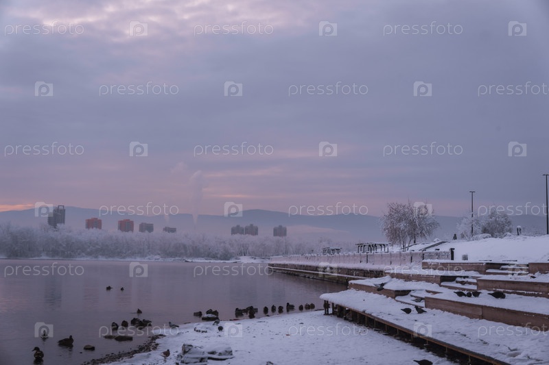 Раннее зимнее морозное утро над Енисеем в центре Красноярска