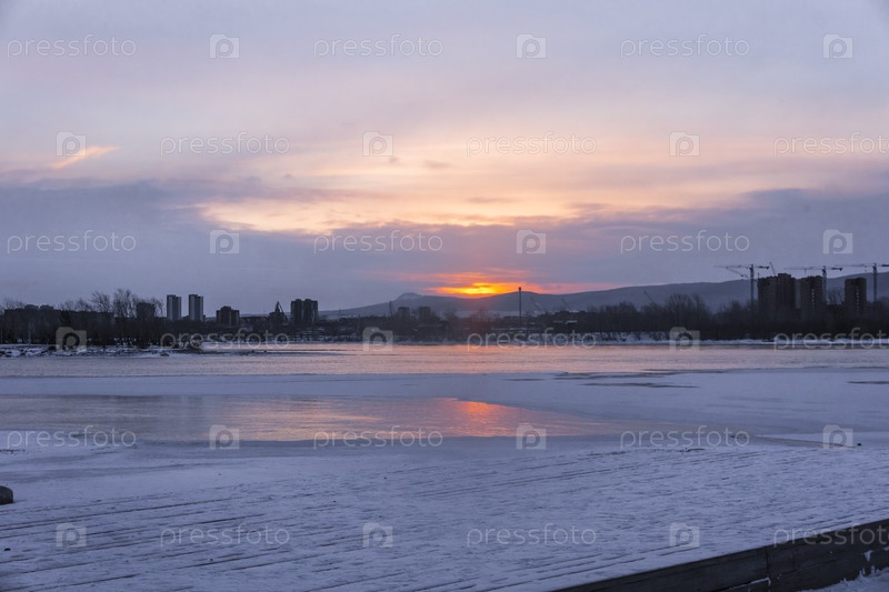 Раннее зимнее морозное утро над Енисеем в центре Красноярска