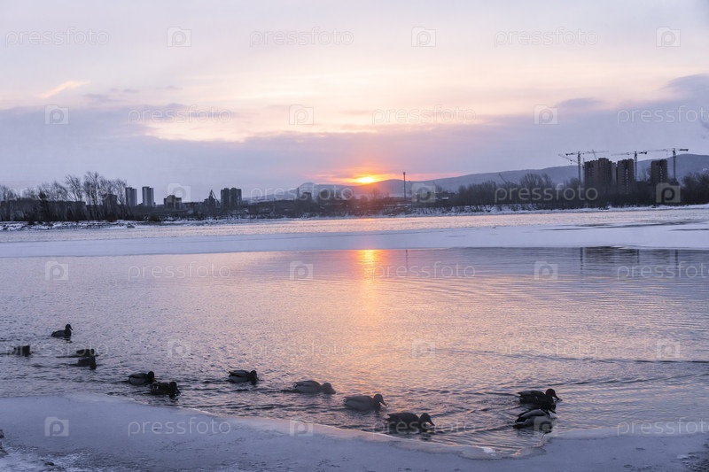 Раннее зимнее морозное утро над Енисеем в центре Красноярска