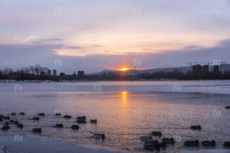 Раннее зимнее морозное утро над Енисеем в центре Красноярска
