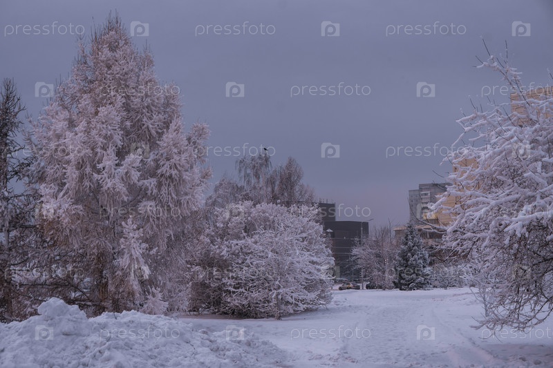 Раннее зимнее морозное утро над Енисеем в центре Красноярска
