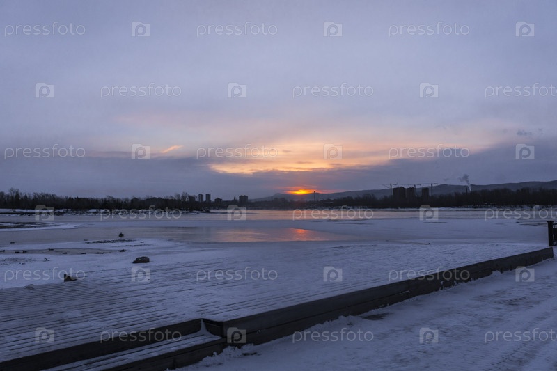 Раннее зимнее морозное утро над Енисеем в центре Красноярска