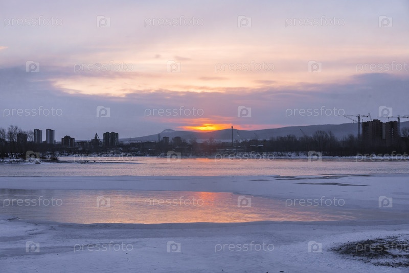 Раннее зимнее морозное утро над Енисеем в центре Красноярска