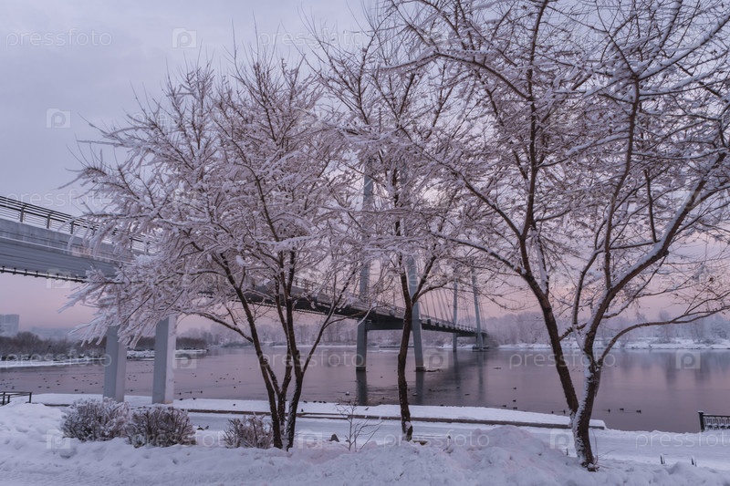 Раннее зимнее морозное утро над Енисеем в центре Красноярска