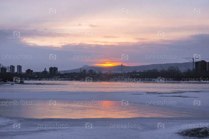 Раннее зимнее морозное утро над Енисеем в центре Красноярска
