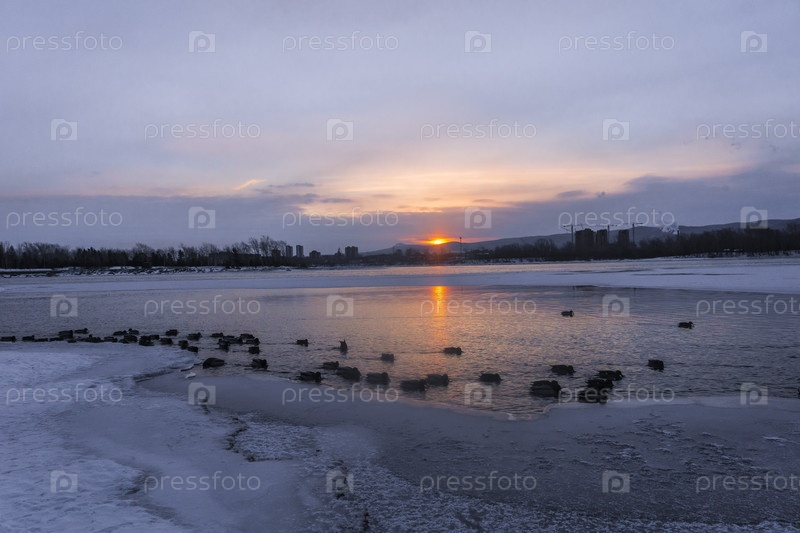 Раннее зимнее морозное утро над Енисеем в центре Красноярска