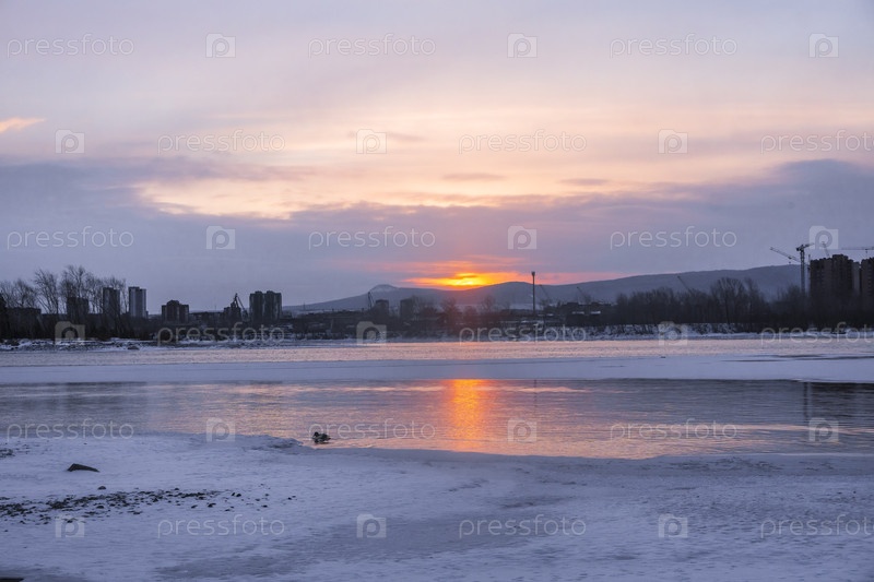 Раннее зимнее морозное утро над Енисеем в центре Красноярска