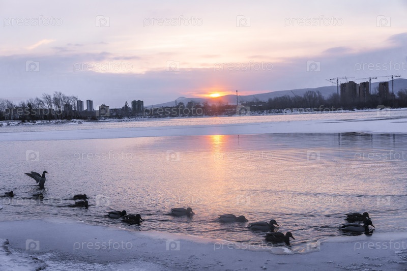 Раннее зимнее морозное утро над Енисеем в центре Красноярска