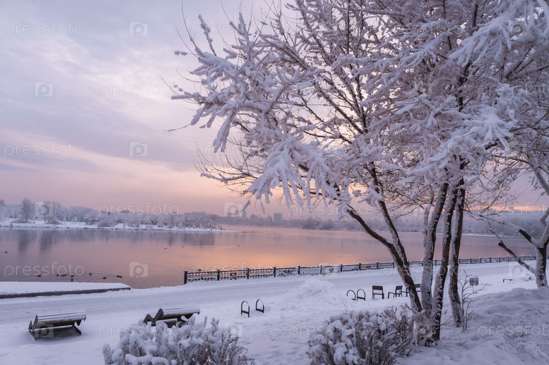 Раннее зимнее морозное утро над Енисеем в центре Красноярска