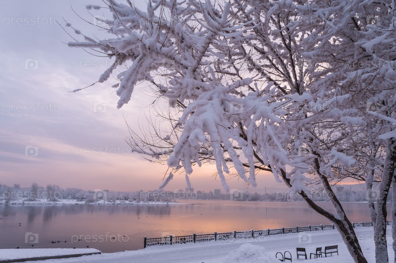 Раннее зимнее морозное утро над Енисеем в центре Красноярска