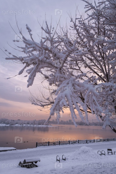 Раннее зимнее морозное утро над Енисеем в центре Красноярска