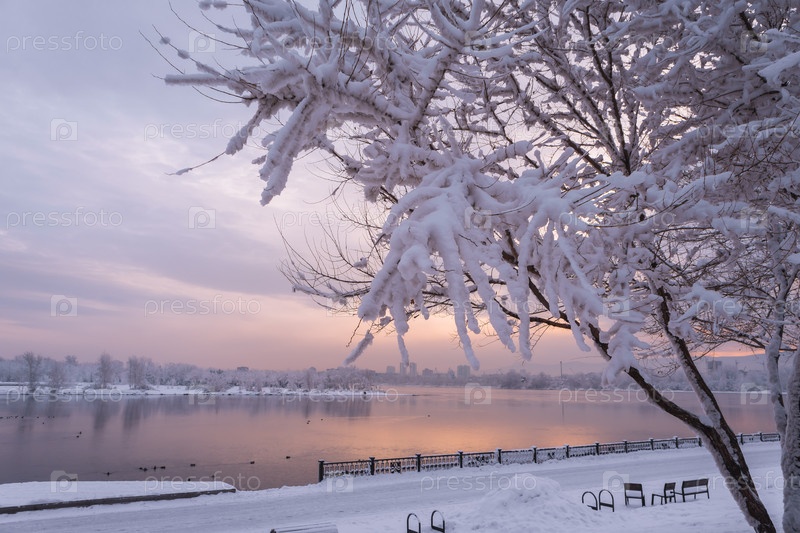 Раннее зимнее морозное утро над Енисеем в центре Красноярска