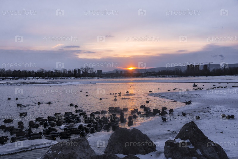 Раннее зимнее морозное утро над Енисеем в центре Красноярска