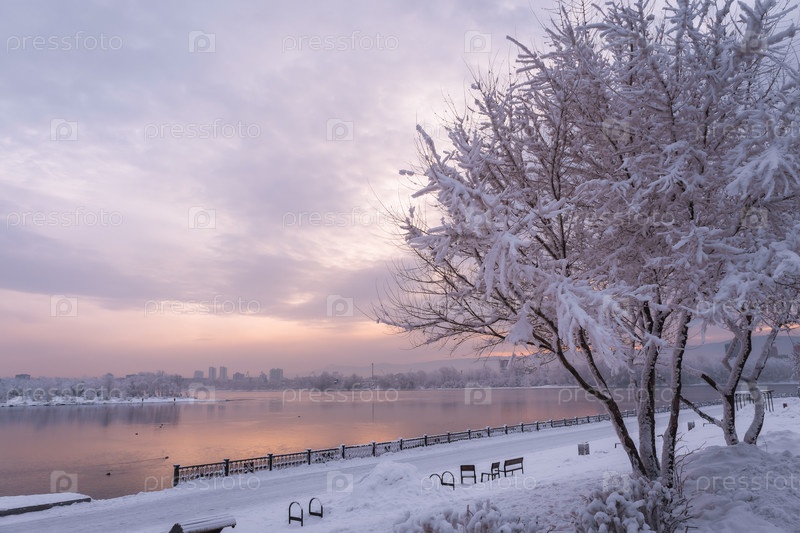 Раннее зимнее морозное утро над Енисеем в центре Красноярска