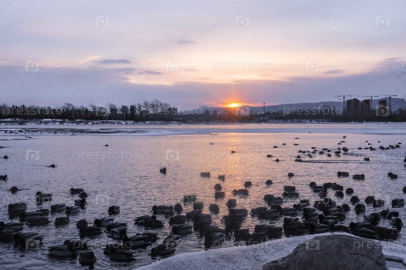 Раннее зимнее морозное утро над Енисеем в центре Красноярска