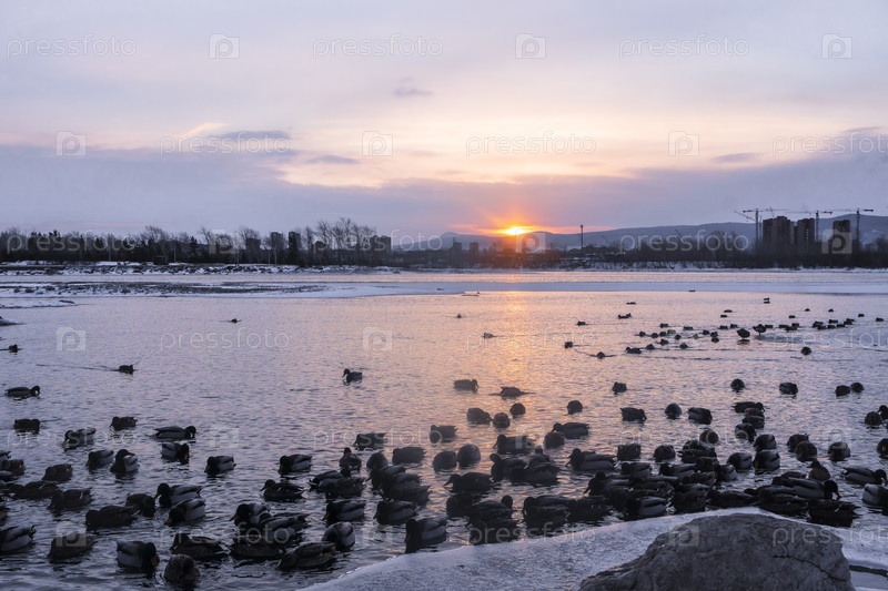 Раннее зимнее морозное утро над Енисеем в центре Красноярска